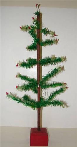 VINTAGE FEATHER CHRISTMAS TREE WITH RED PAINTED STAND. Good condition. Overall 26.5” H.