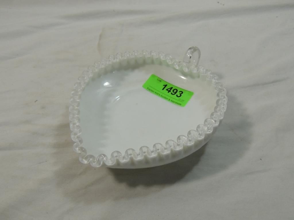 VINTAGE FENTON MILK GLASS SILVER CREST HEART DISH WITH RUFFLED EDGE MILK GLASS CANDY DISH AS SHOWN SEE PHOTO FOR MORE DETAILS.