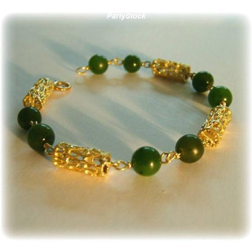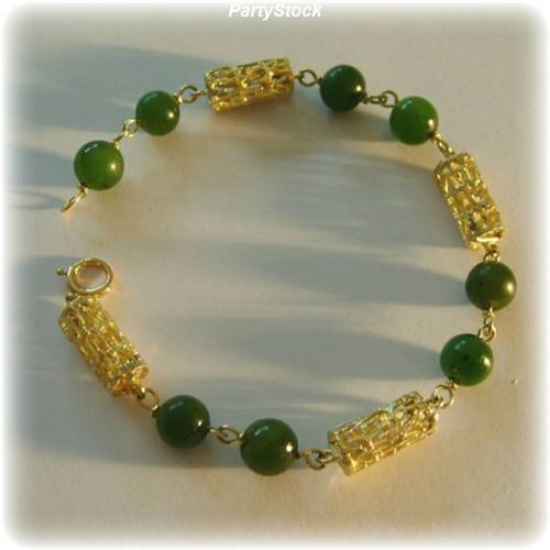 Product Materials: Solid 14K Gold & Genuine Jade Beads<BR>><BR><BR> <p> This is a Vintage item. <p> Please note: our merchandise is guaranteed 100% to your satisfaction. If you DON'T LOVE this item, simply return it for a complete refund of your purchase price. Our feedback is extremely positive, so you can shop with confidence, knowing that your satisfaction is our primary concern. <p> * Insurance is included in our Domestic Shipping charges: $6 for first item and $3 for each additional item.