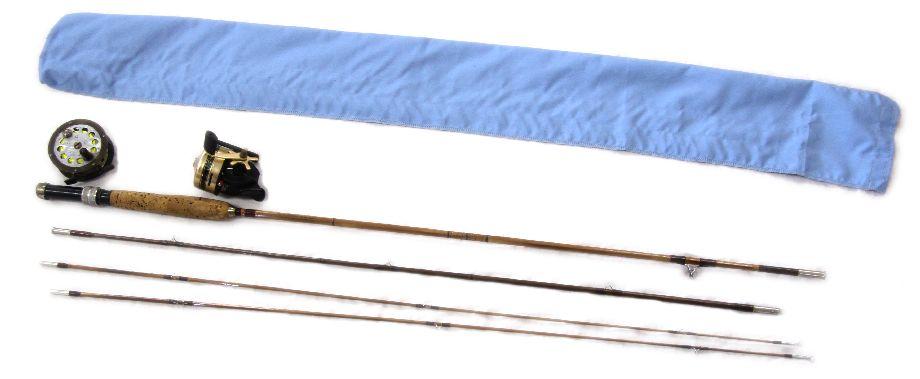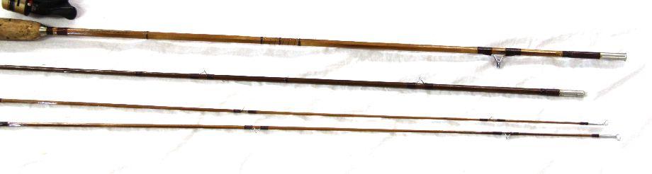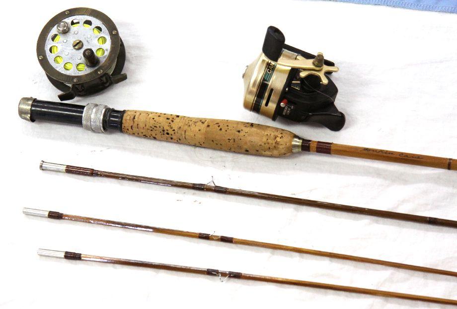 A lot of vintage fishing gear, including an 8 foot 6 inch Heddon Governor model bamboo fishing rod with red wraps, cork handle, and cloth case, a Pflueger Progress No 1774 reel, and a Shakespeare "Cant Twist" Series 70/20 reel. Very good condition.