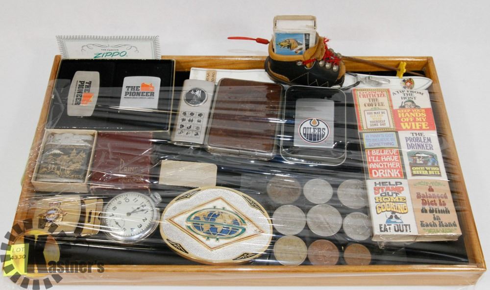 2 ZIPPOS 1 OILERS WITH ORIGINAL BOXES, 1, 1954 PRINCE SUPER LIGHTER (SEALED) W/ORIGINAL BOX, 6 SEALED PACK OF MATCHES, SKI MATCH HOLDER, COINS US 2 HALF DOLLARS 1974, 77 & MORE.