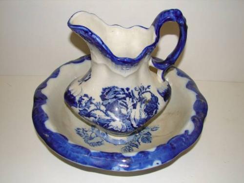 VINTAGE FLOW BLUE WASHBOWL AND PITCHER SET. Pitcher 10.5” tall. Bowl 14.5” Diameter. Pitcher in excellent condition, Bowl with some discoloration.