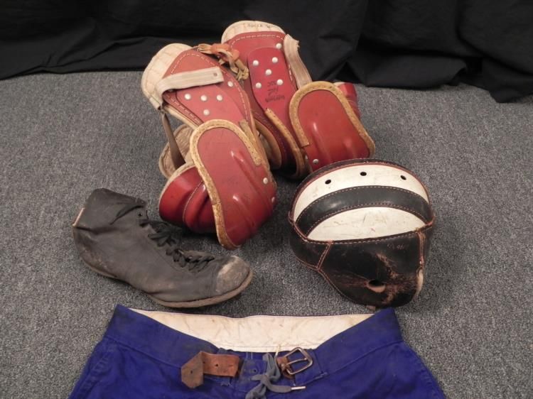 VINTAGE FOOTBALL EQUIP GROUPING-1940's-2 PR PANTS-LEATHER HELMET-PADS-CLEATS+DUFFEL * * GREAT VINTAGE GROUPING OF ADULT SIZED FOOTBALL EQUIPMENT FROM THE 30's-40's--HELMET IS BLACK AND WHITE LEATHER W/CHINSTRAP AND PARTIAL WOOL INTERIOR--SHOULDER PADS ARE GOLD SMITH PREFERRED (MacGREGOR?) SIZE 33C--BLUE LACE UP FOOTBALL PANTS WITH LEATHER BUCKLE & BELT--TAN/LIME COLORED FB PANTS W/2033 SEWN IN-BELT FRONT--30's HIGH TOP LEATHER FOOTBALL CLEATS--ALL WITH THE DUFFEL BAG THEY WERE STORED IN *
