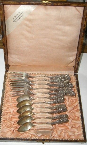 11 PIECE VERY OLD VINTAGE FORK & SPOON SILVER SET. SET LOOKS TO BE FROM DEUTSCHLAND WITH AN INCREDIBLE ROSE DESIGN ON ALL HANDLES!! *SILVER SET IN ORIGINAL BOX*!! SILVER SET CAME OUT OF SAFE BOX!! ***Coin, Currency & All Items Listed in this auction - Grades, Conditions and Values are not Safe Deposit Coins LLC Responsibilty. Grades, Condition and Values are determined by Consigner(s) & Buyers ONLY