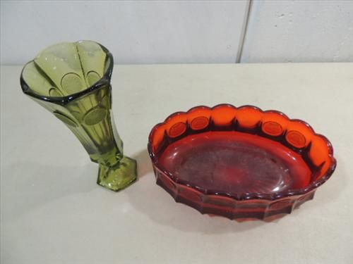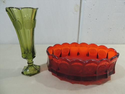 VINTAGE FOSTORIA COIN MEDALLION RUBY & GREEN GLASS VASE & BANANA BOAT. AS SHOWN. VIEW PICTURE FOR DETAIL.