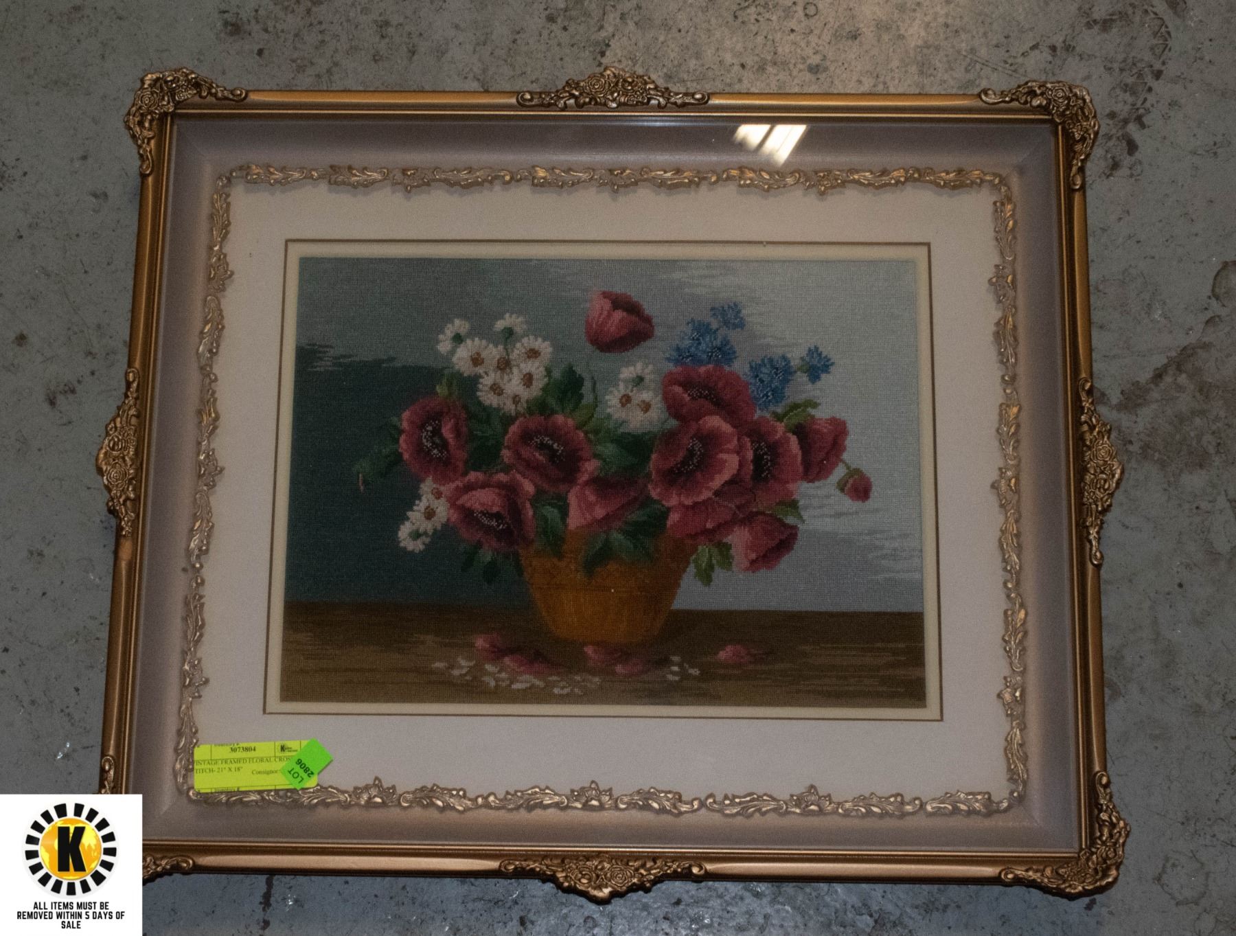 VINTAGE FRAMED FLORAL CROSS STITCH- 21" X 18"