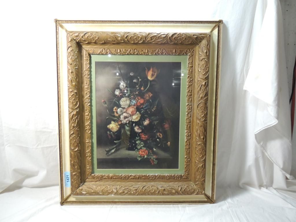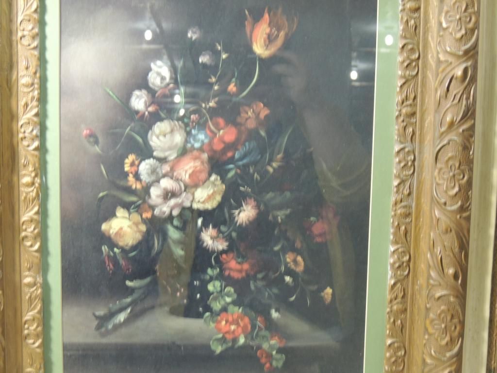 FLOWERS PAINTING FRAMED. DETAILED FRAME. VINTAGE. DARK AS SHOWN .SEE PHOTO FOR MORE DETAILS. 26 X 30