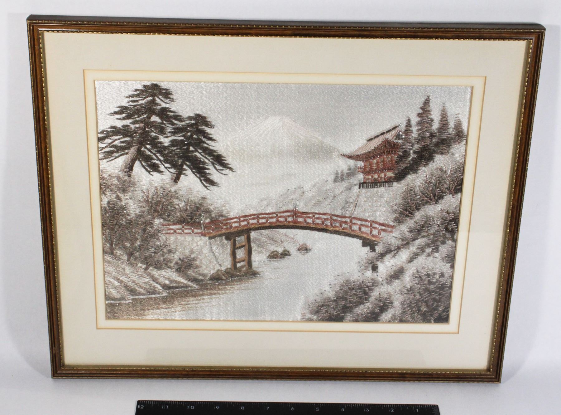 VINTAGE FRAMED PIECE OF SILK EMBROIDERY ART OFTEN HAND STITCHED THESE ARTS ARE ALSO SOMETIMES REFERRED AS SUSHO.HIGHT 38 INCHES, LENGTH 48 INCHES.