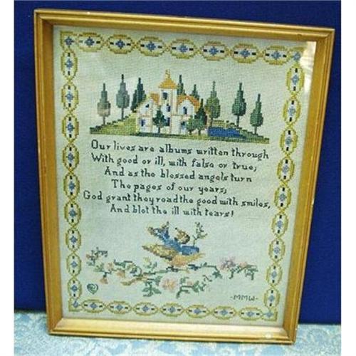 GORGEOUS FRAMED VINTAGE PICTURE, DEPICTING BEAUTIFUL SAMPLER, IN VERY GOOD CONDITION - MEASURING 13" X 10 1/4", US Buyer to pay 14.00 for shipping plus insurance.THANKS.