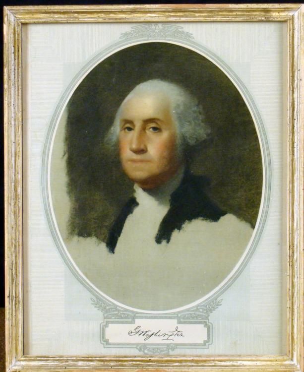 VINTAGE FRAMED PRINT OF GEORGE WASHINGTON-FRAMED W/GLASS-10 3/4"X8 3/4" * OUTSTANDING * VINTAGE PRINT OF OUR FIRST PRESIDENT IN AN OVAL FORMAT W/SIGNATURE ON BOTTOM * & EAGLE ON TOP-REVERSE NOTES CIRCA * 1935