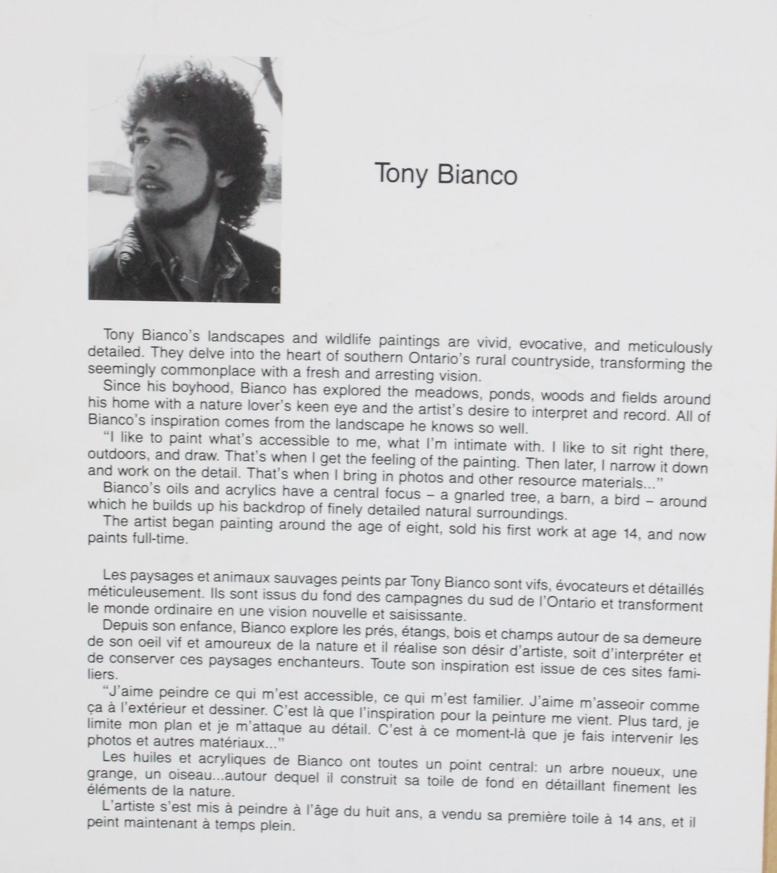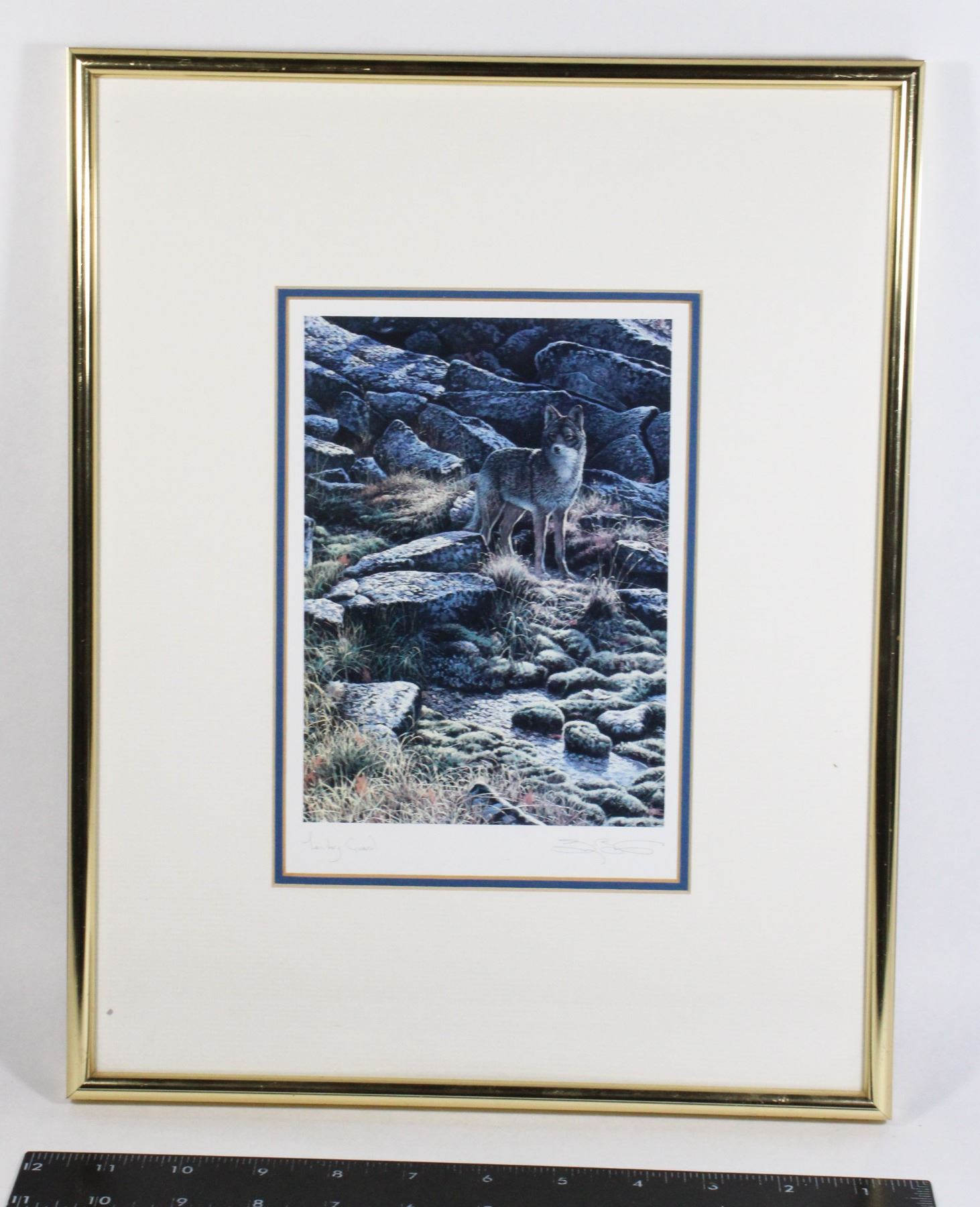 VINTAGE FRAMED WOLF PICTURE TONY BIANCO.HIGH 38 INCHES, LENGTH 30 INCHES.
