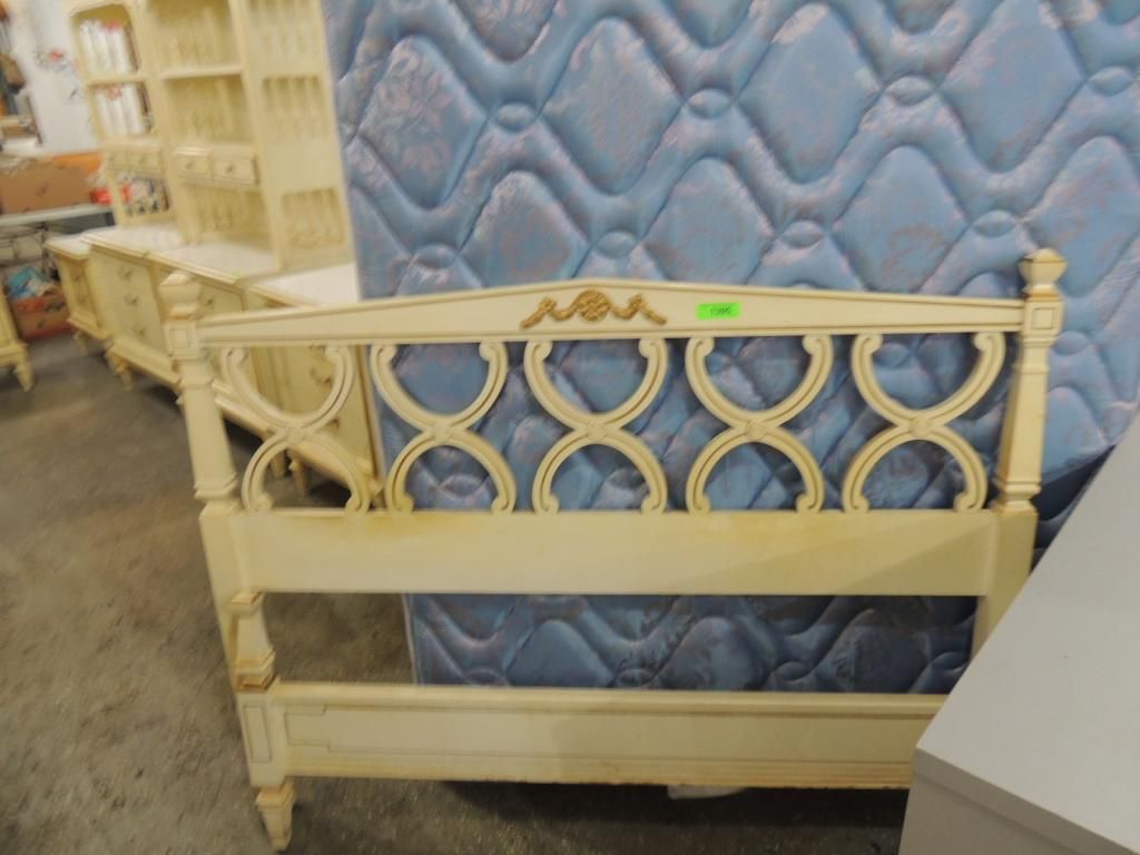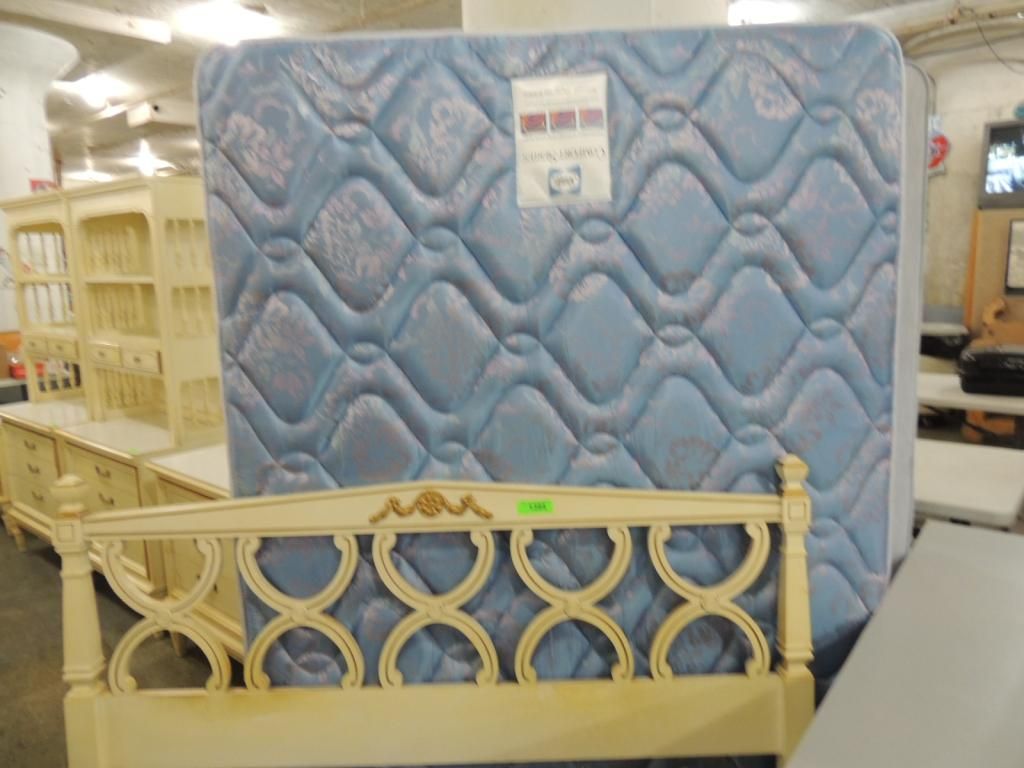 VINTAGE WHITE CREAM WOODEN HEADBOARD AND FOOTBORAD MATTRESS AND BOX SPRING INCLUDED. AS SHOWN SEE PHOTO FOR MORE DETAILS.