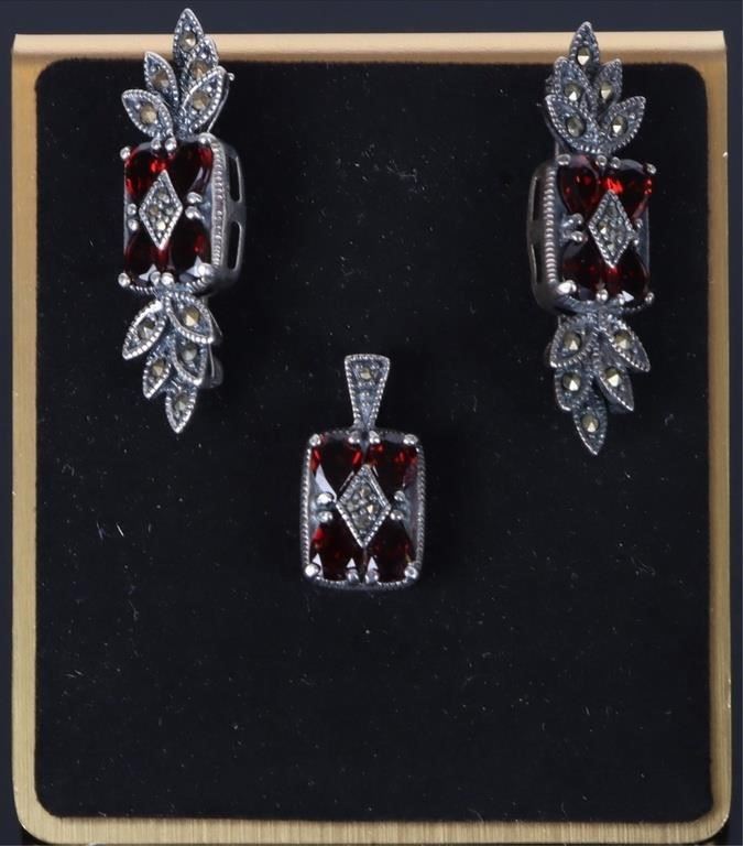 Vintage garnet sterling silver ladies jewelry set to include a ring, two brooches, and one pendant.
