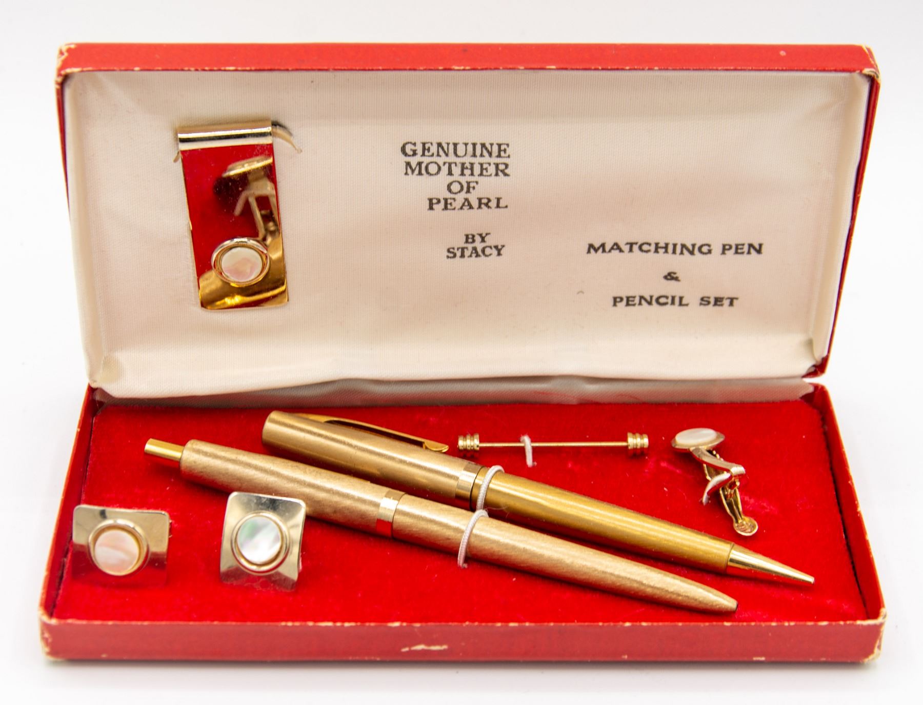 BY STACY 7PC PEN/PENCIL SET, CUFFLINKS, MONEY CLIP, TIE CLIPS IN ORIGINAL CASE