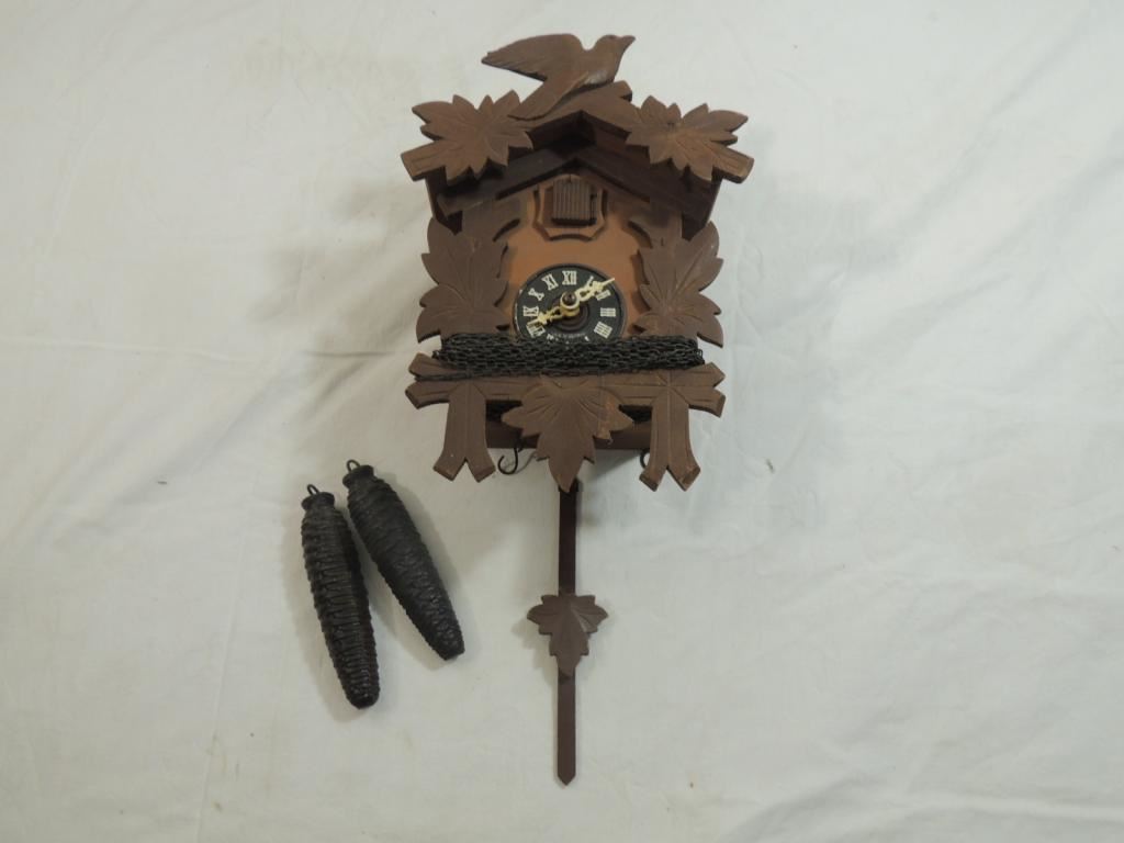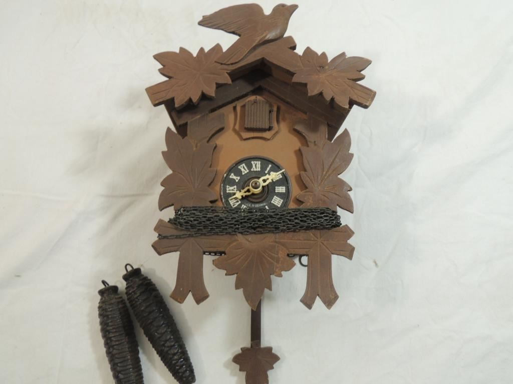 CUCKOO CLOCK, GERMAN CLOCK, COO COO CLOCK, WORKING CLOCK, WOODEN DETAIL CLOC, BLACK FOREST CLOCK, VINTAGE COLLECTORS CLOCK, AS SHOWN SEE PHOTO FOR MORE DETAILS.