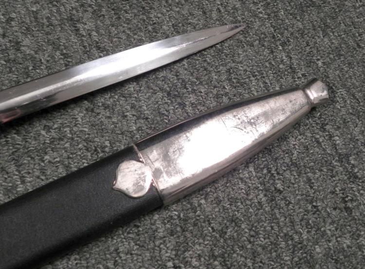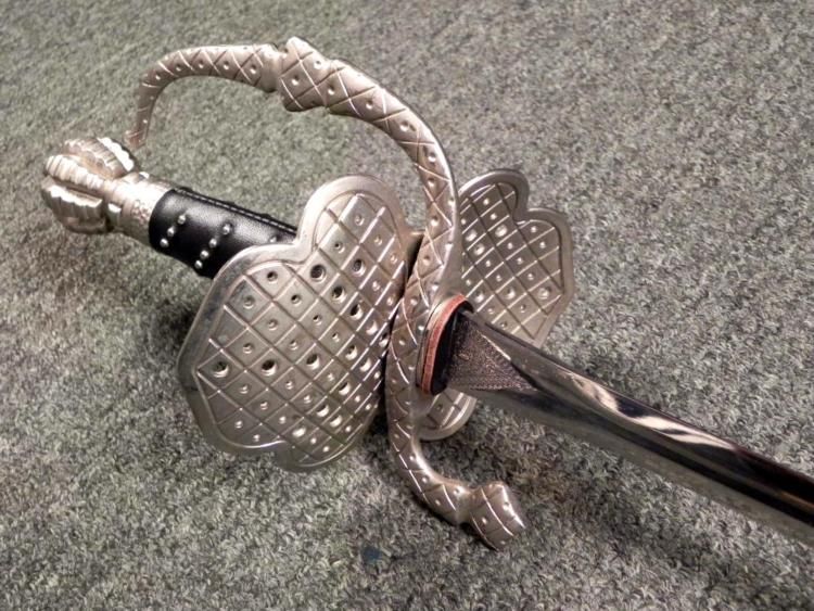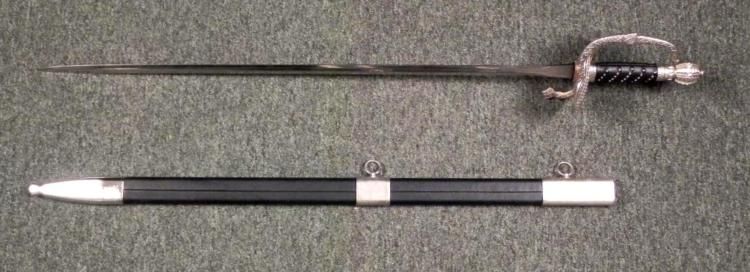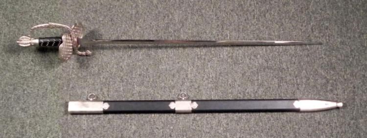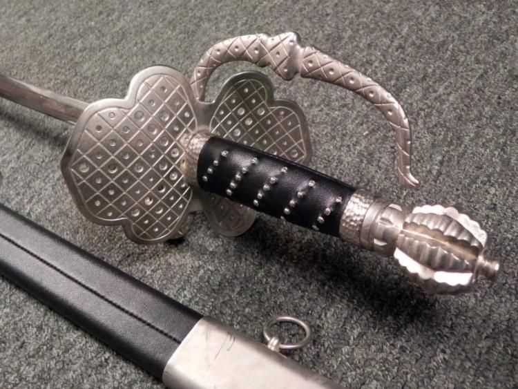 VINTAGE GERMAN RAPIER SWORD W/SCABBARD-40" O/A-DETAILED HEAVY METAL HILT LARGE ROUND SPLIT SEGMENT POMMEL--DOUBLE PIERCED METAL UP-AND-"DOWN HANDGUARD--WRAPPED GRIP WITH FIRM GRIP NUBS--WRAP AROUND ""D"" GUARD""WITH DOWNWARD END--NARROW 30"" BLADE WITH ENGRAVED DOUBLE SIDED RICASSO--"LEATHER BUFFERHEAVY METAL AND LEATHER WRAPPED SCABBARD-1900'S SWORD INVG CONDITION-QUALITY RAPIER
