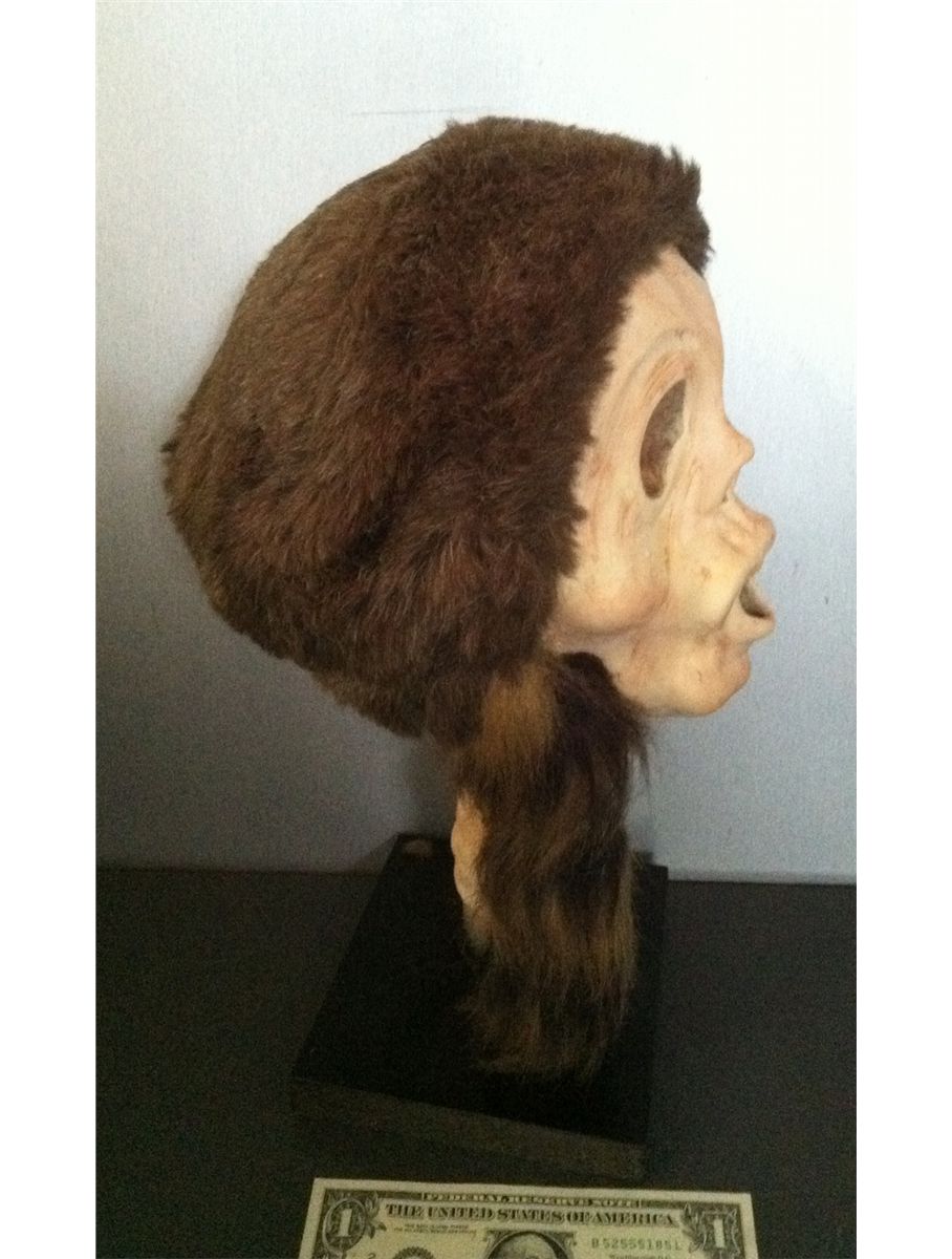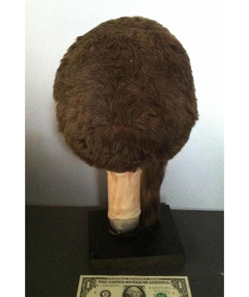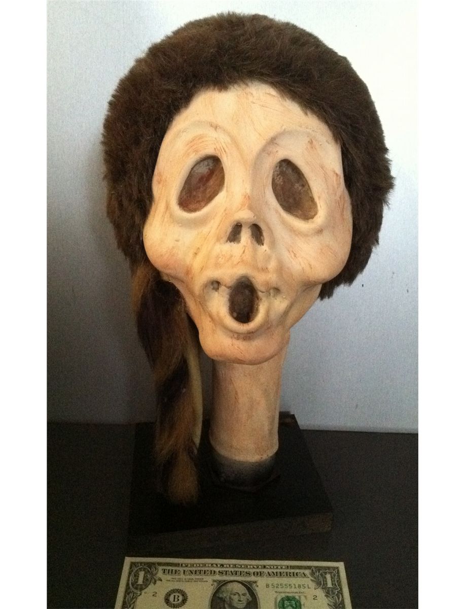 Offered here is a very cool and creepy looking vintage skull head with neck wearing a raccoon fur hat. Looks like the ghost of Daniel Boone. Makes a nice display. (Stand is not included)
