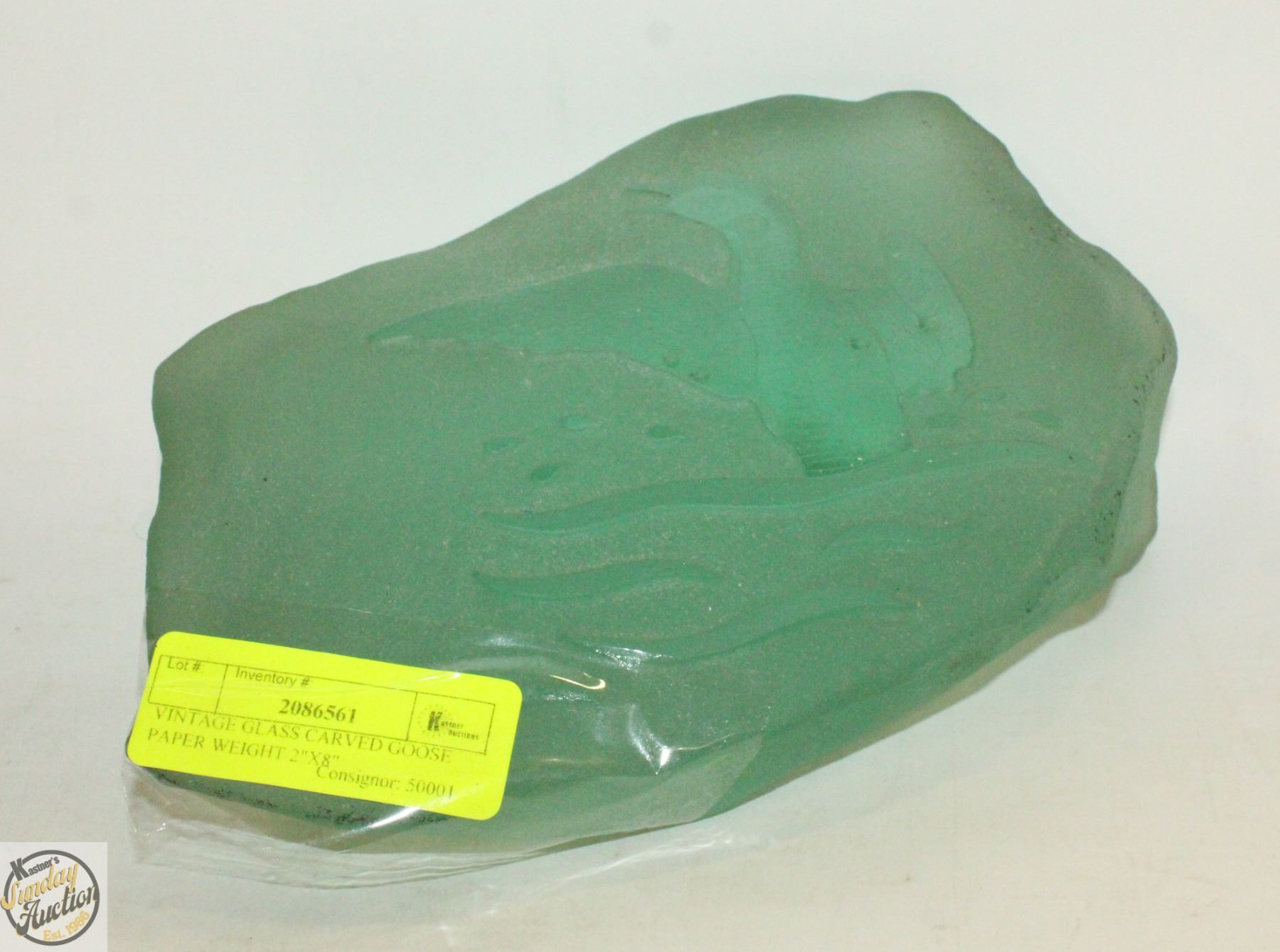 VINTAGE GLASS CARVED GOOSE PAPER WEIGHT 2"X8"