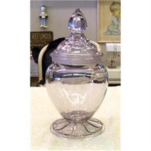 This is a vintage country store counter Jar. It might have held something like candy or could have been displayed back in the Pharmacy of the country store. It is glass which has a vey light purple cast to it and is in good condition. On the inside of the lid on the bottom rim there is something that I dont know what it is. It may be an internal flaw but you can't feel it .(See the Pictures). Also a tiny sliver on the tip of the lid, hardly noticeable. It is 10 1/2" tall and the base is 5" round.