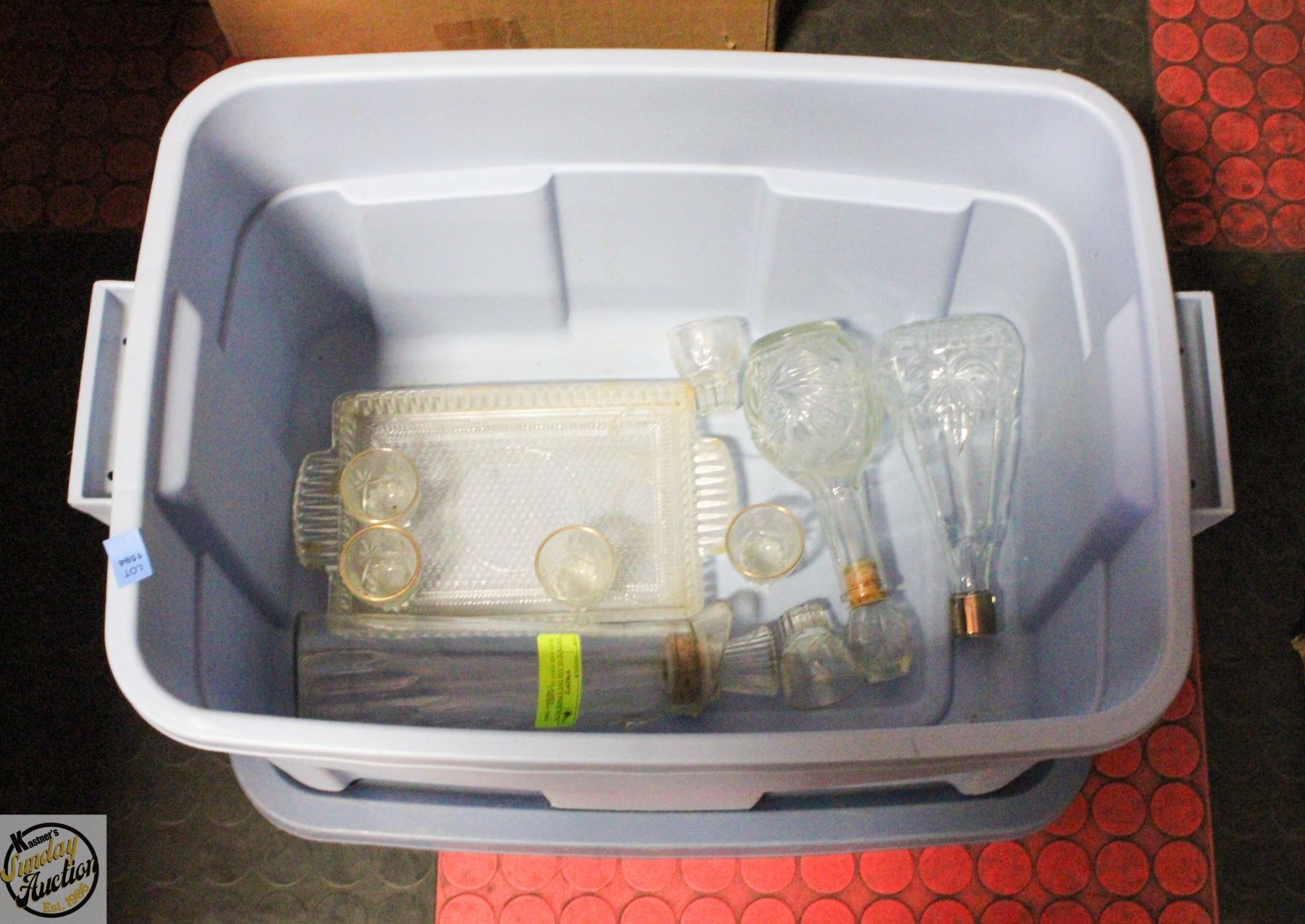 VINTAGE GLASS DECANTER WITH TRAY AND SHOT GLASSES