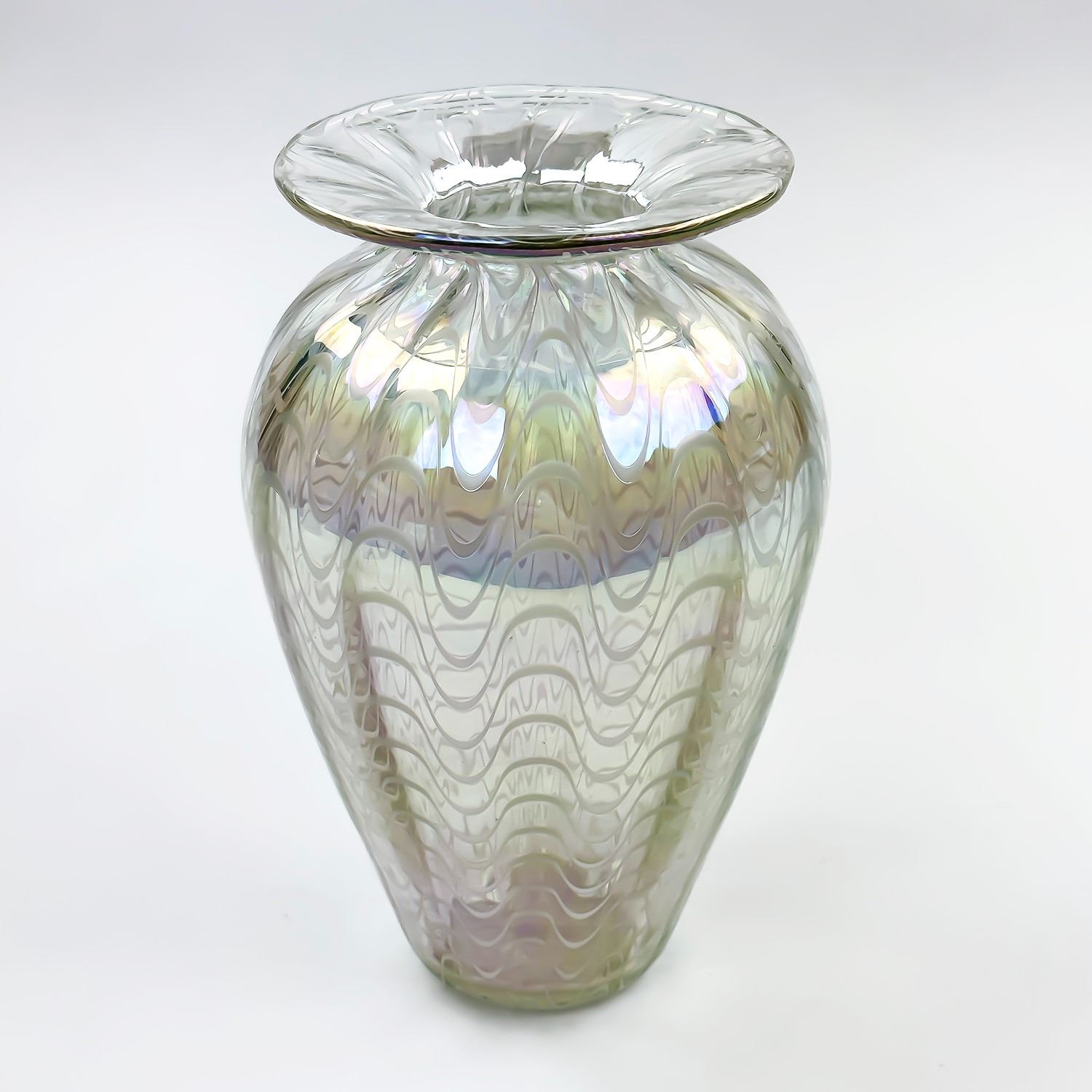 #8073 - VINTAGE HAND BLOWN GLASS VASE FROM GLASS EYE STUDIOS IN SEATTLE, WASHINGTON. SIGNED ETCHED ON BOTTOM: EYE GLASS STUDIO… AND I BELIEVE IT IS DATED 1991. A DIFFERENT… BUT ROUND SHAPE VASE WITH THIS IDENTICAL PATTERN WAS MADE IN 1989.MEASURES:***ITEM(S) LOCATED IN LETHBRIDGE ALBERTA. FREE TRANSPORT TO EDMONTON OFFICE AVAILABLE FOR THIS AUCTION. WORLDWIDE SHIPPING IS AVAILABLE FOR ALL ITEMS