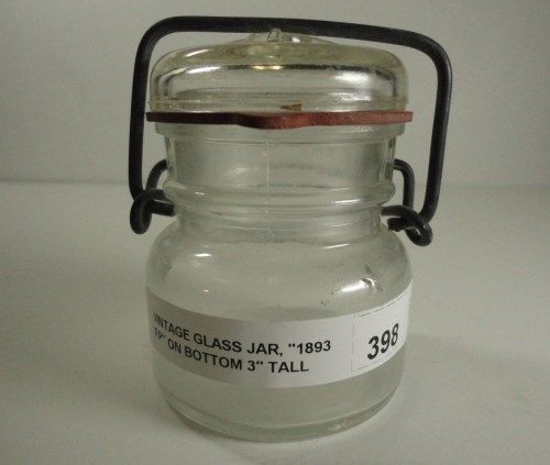 VINTAGE GLASS JAR, "1893 FP" ON BOTTOM 3" TALL