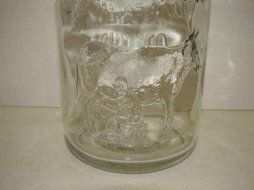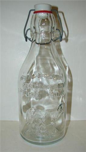 VINTAGE GLASS MILK BOTTLE. Embossed decoration on bottle depicts a farmer milking a cow and text reads "Absolutely/Pure Milk/Thatcher's Dairy/Bottle Patent 1884/One Quart". Bottle has porcelain cap. 10.5" H