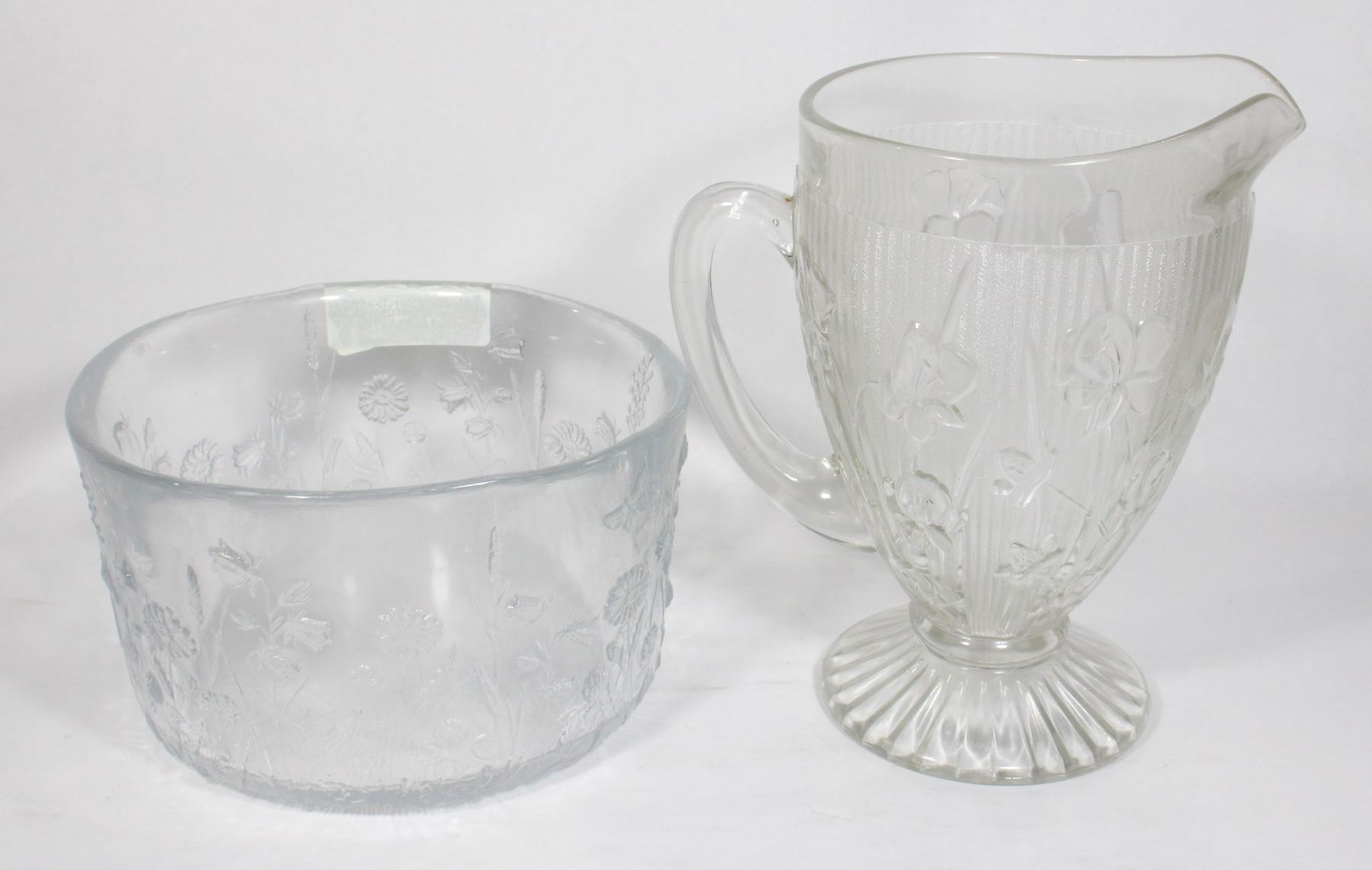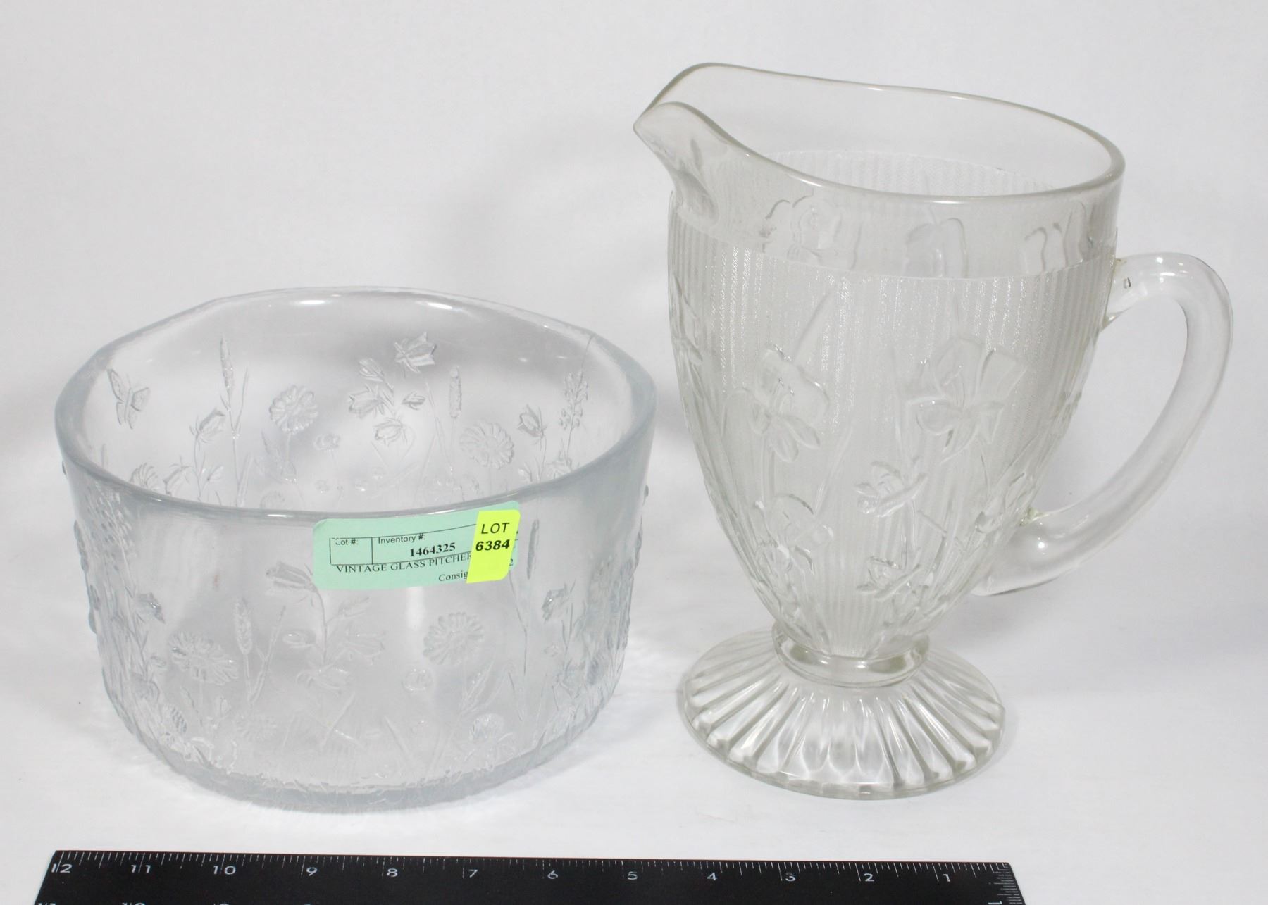 VINTAGE GLASS PITCHER & BOWL WITH FLOWER PATTERNS.