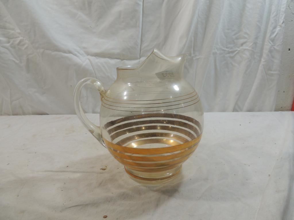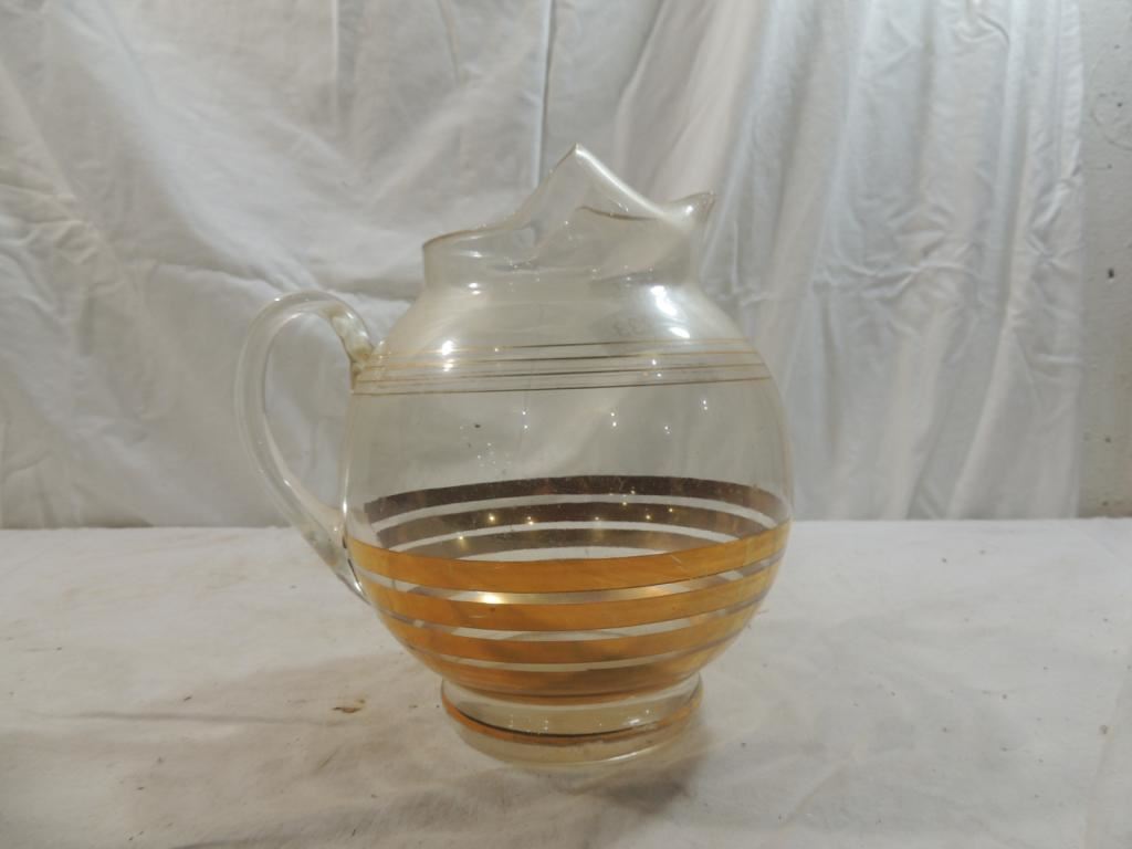 VINTAGE GLASS PITCHER GOLD STRIPES, DECORATIVE GOLD STRIPES, GLASS PITCHER VINTAGE AS SHOWN SEE PHOTO FOR MORE DETAILS.