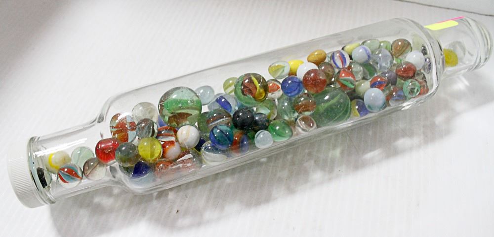 VINTAGE GLASS ROLLING PIN FULL OF ASSORTED MARBLES