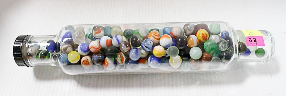VINTAGE GLASS ROLLING PIN FULL OF ASSORTED MARBLES