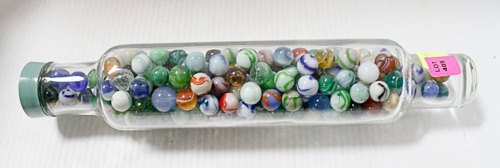 VINTAGE GLASS ROLLING PIN FULL OF ASSORTED MARBLES