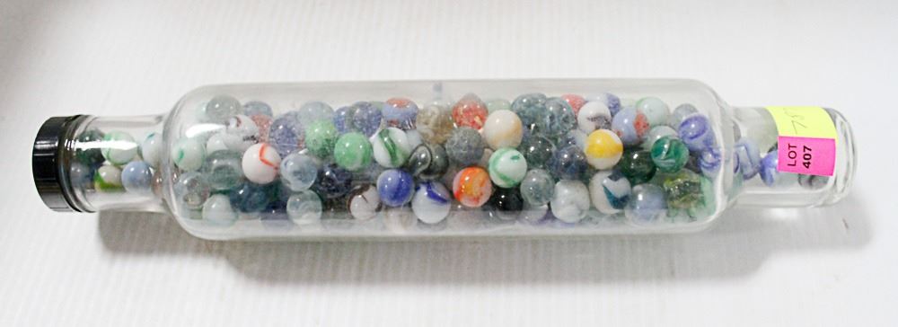 VINTAGE GLASS ROLLING PIN FULL OF ASSORTED MARBLES