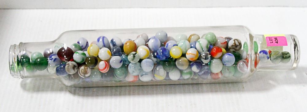 VINTAGE GLASS ROLLING PIN FULL OF ASSORTED MARBLES