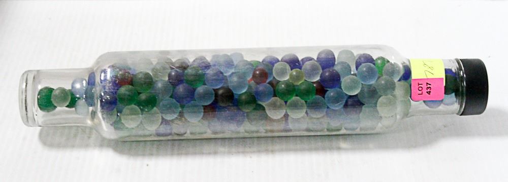 VINTAGE GLASS ROLLING PIN FULL OF ASSORTED MARBLES