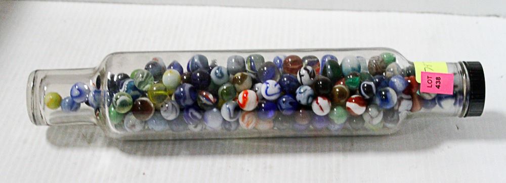 VINTAGE GLASS ROLLING PIN FULL OF ASSORTED MARBLES