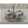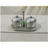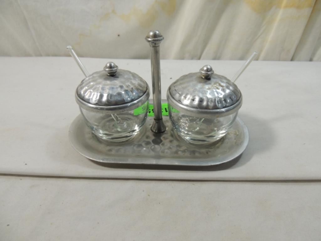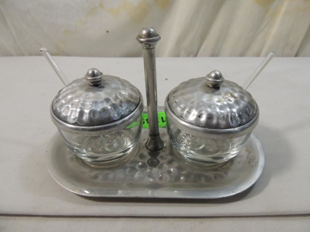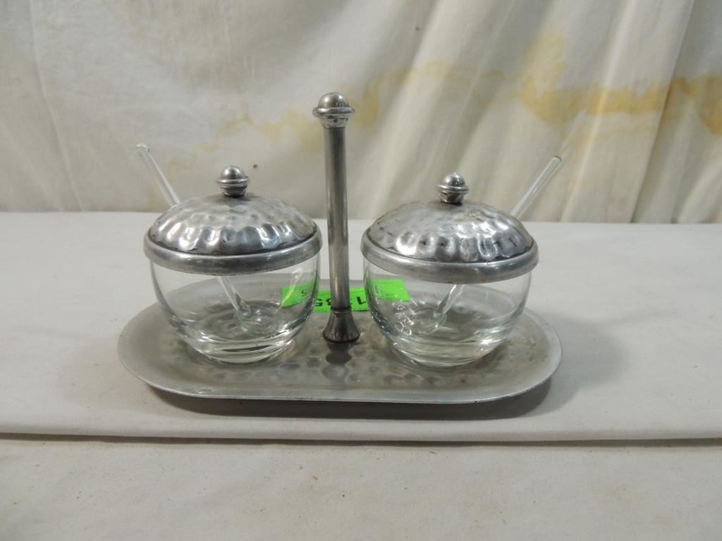 VINTAGE GLASS SUGAR BOWL SET VINTAGE GLASS & METAL DISPLAY SET, HAMMERED LID, GLASS SPOON, AS SHOWN SEE PHOTO FOR MORE DETAILS.