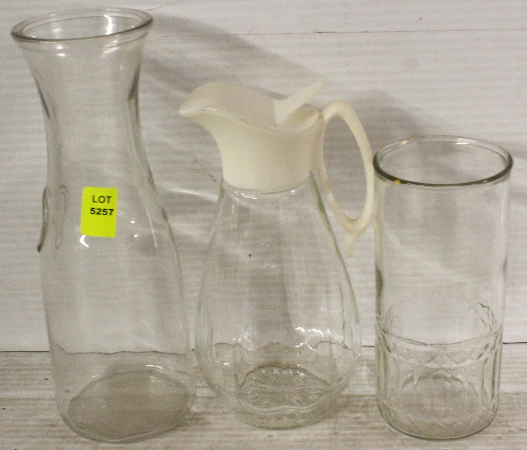 VINTAGE GLASS SYRUP JAR WITH GLASS VASE & CUP