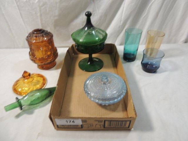 NICE LOT OF VINTAGE GLASSWARE. PARTY LITE CANDLE HOLDER IN AMBER, BLUE DEPRESSION ERA COVERED CANDY DISH, GLASS STOPPER. AND MORE, AS SHOWN. ALL FOR ONE MONEY.