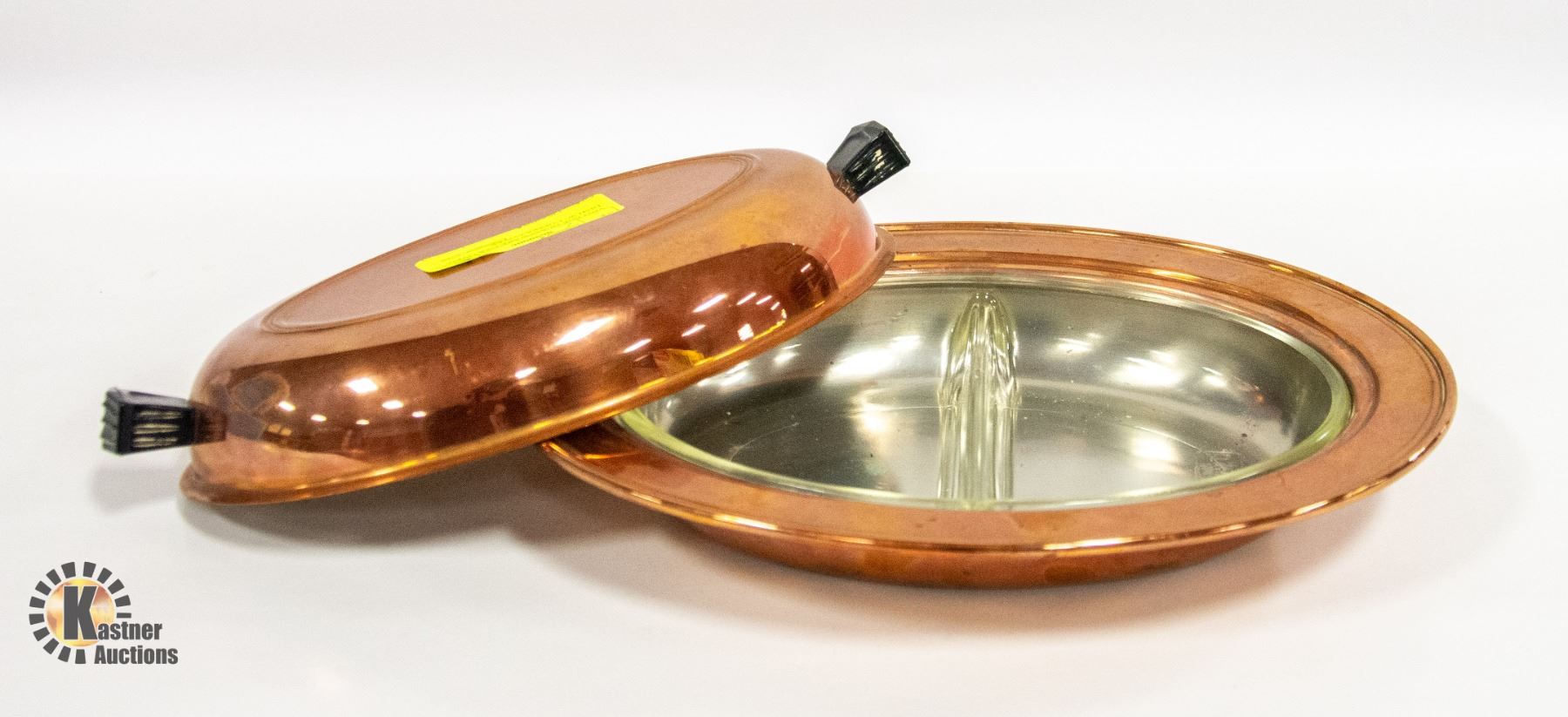 VINTAGE GLASSWARE USA OVEN DISH W/ COPPER COVER