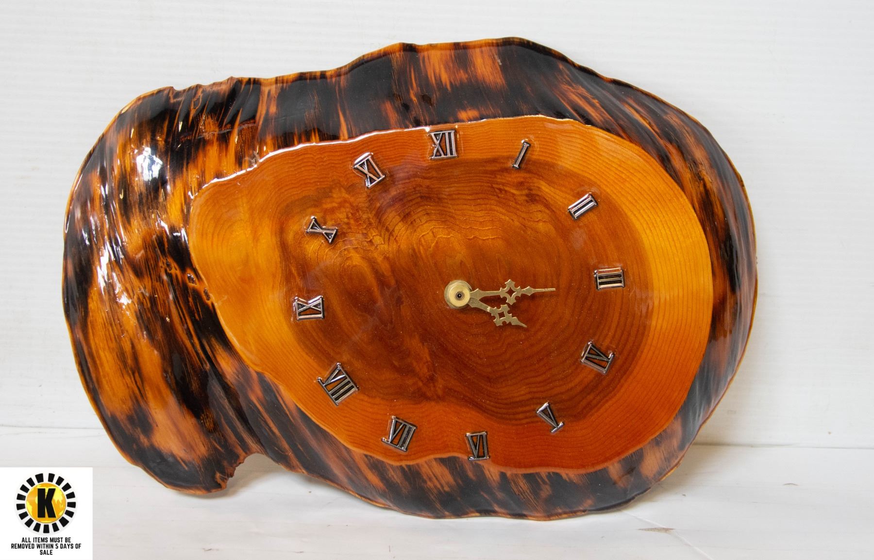 VINTAGE GLAZED BURL WOOD WALL CLOCK- 16" L