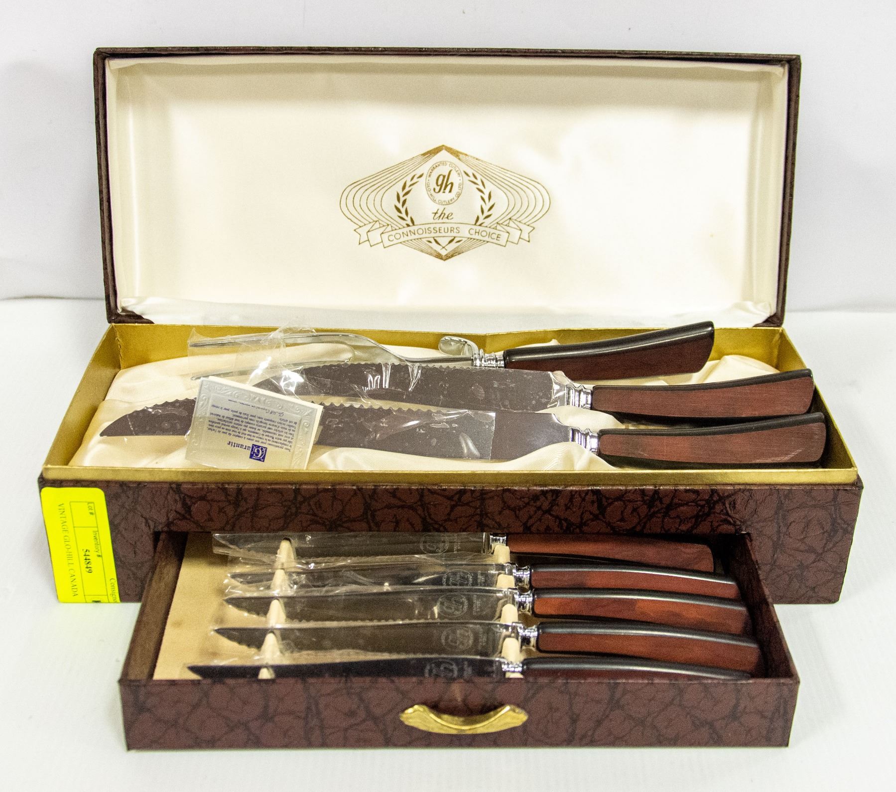 CONNOISSEURS CHOICE 3 PC CUTLERY CARVING SET W/PULL OUT DRAWER 6 PC STEAK KNIFES (UNUSED)