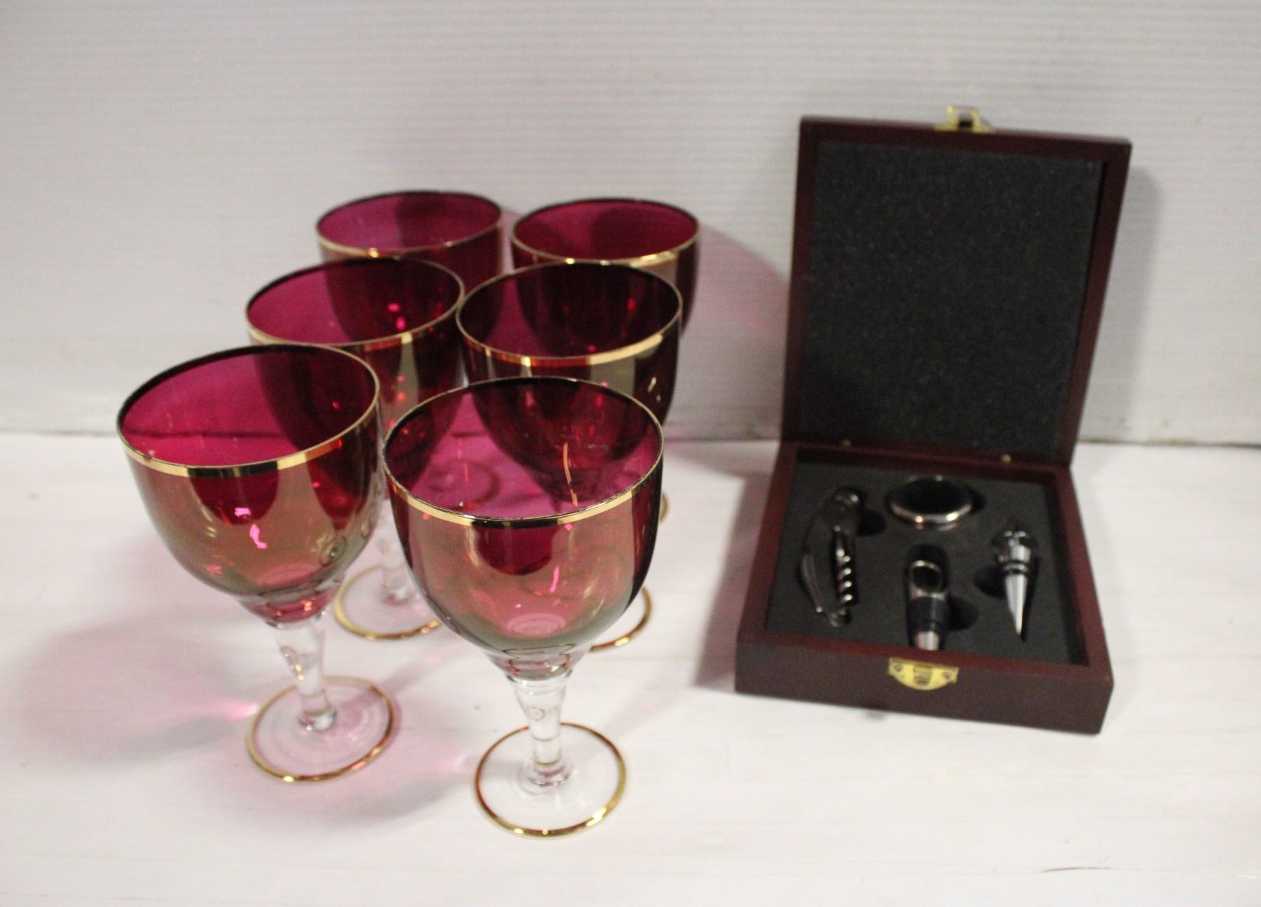 VINTAGE GOLD RIMMED WINE GLASSES W/CORKING SET