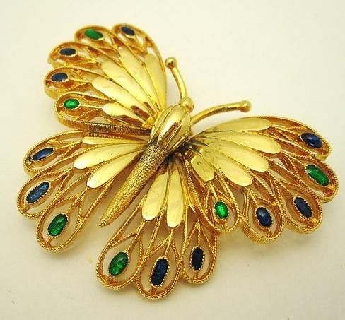 VINTAGE GOLD TONE BUTTERFLY PIN BROOCH WITH FOIL GLASS CABOCHONS, MEASURES 2 1/2IN x 1 7/8IN 2077