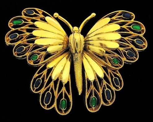 VINTAGE GOLD TONE BUTTERFLY PIN BROOCH WITH FOIL GLASS CABOCHONS, MEASURES 2 1/2IN x 1 7/8IN 2077