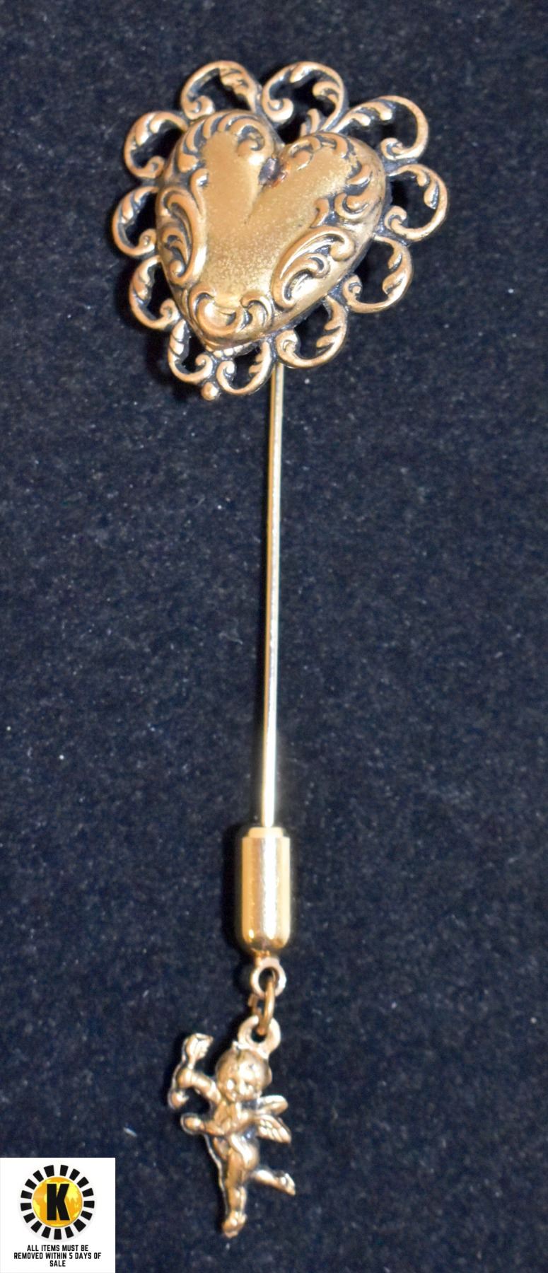 VINTAGE GOLD TONE CUPID AND HEART PIN