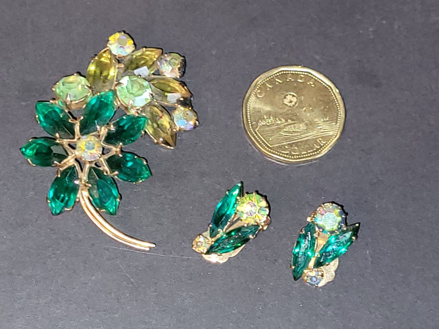 VINTAGE GREEN CRYSTAL BROOCH AND CLIP ON EARRINGS
