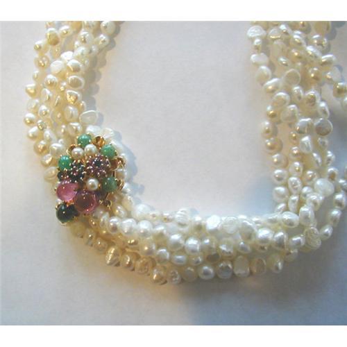 VINTAGE 60'S GUMPS PEARL TORSADE CHOKER 16" WITH A 14K YELLOW GOLD CLASP SET WITH EMERALDS, PINK TOURMALINES, CULTURED PEARLS & TINY FACETED RUBIES & SAPPHIRES. STAMPED: 14K / Clasp is designed to be worn on the side. Clasp is 1 1/4" long. More images available.