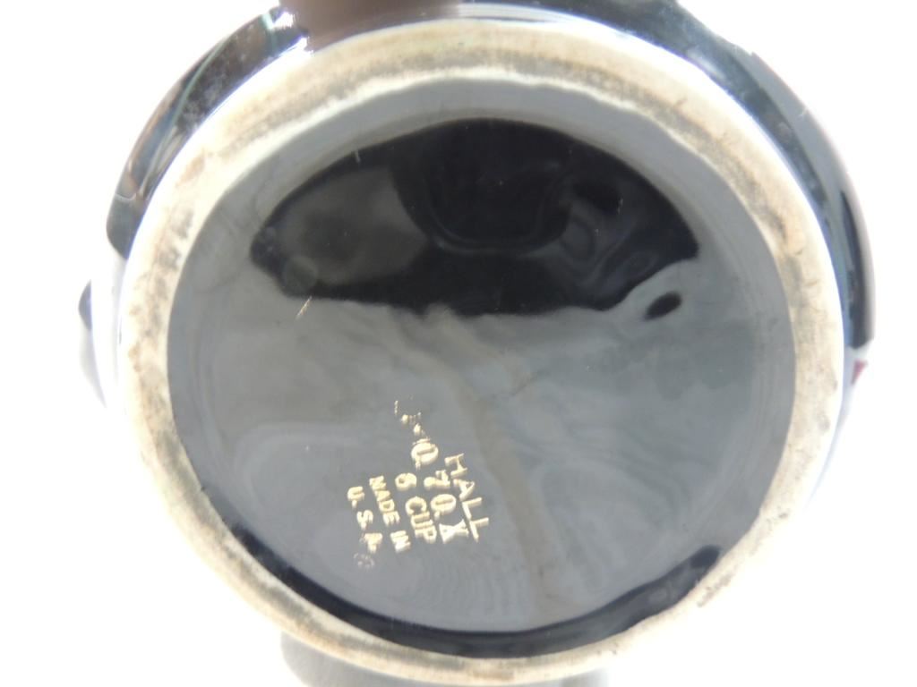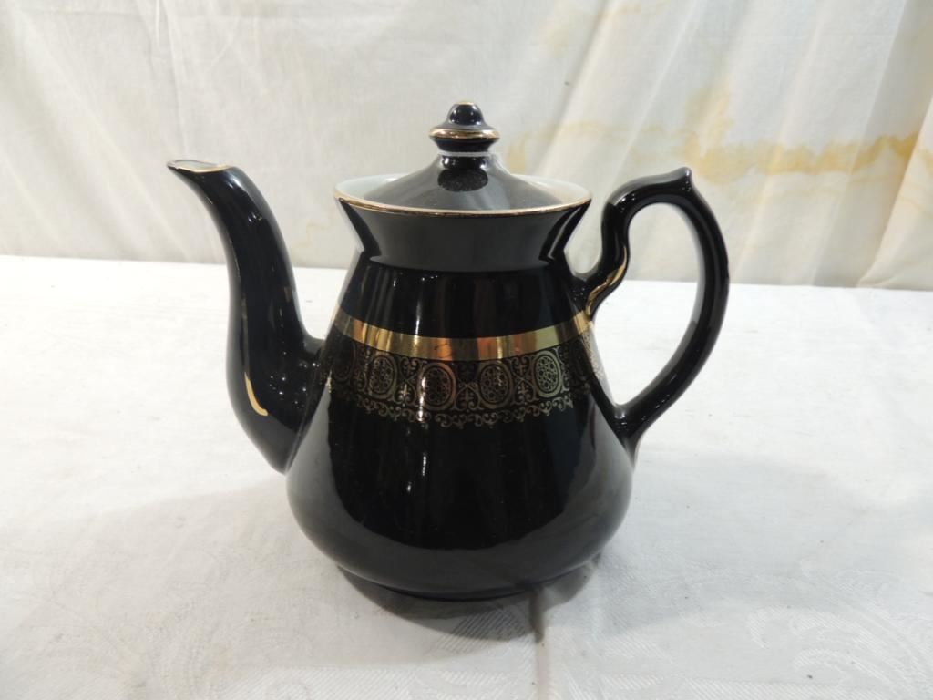 VINTAGE HALL POTTERY TEAPOT, BLACK & GOLD DECORATIVE TEAPOT, POTTERY TEAPOT AS SHOWN SEE PHOTO FOR MORE DETAILS.