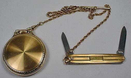 VINTAGE HAMILTON 17 JEWEL POCKET WATCH W/ CHAIN AND POCKET KNIFE IN ORIG. BOX - Inside marked 10K Gold Filled.